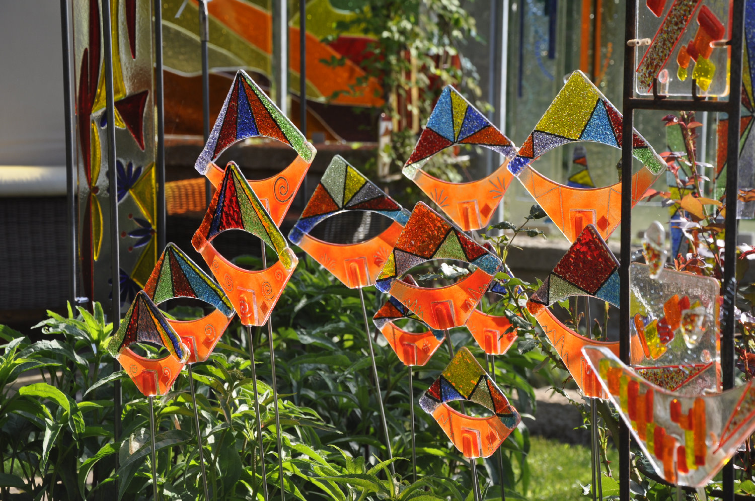 Ein Garten voller Glas ...Inmitten der Blütenpracht zeigt der Garten die farbenfrohen Neuheiten der Gartenobjekte aus Schmelzglas.