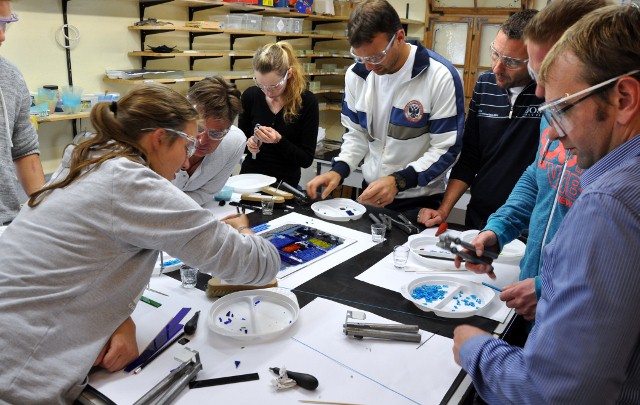 Anschließend werden mit jedem Einzelnen die Designmöglichkeiten für dieses Objekt besprochen und die benötigten Materialien zusammengestellt. Der Umgang mit den jeweiligen Glas Werkzeugen werden unter fachlicher Leitung erklärt und geübt.