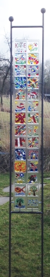Anschließend werden diese zum Gesamtwerk „Das Gläserne Jahrbuch 4 c / 2017 “ verschmolzen und im Schulgarten aufgestellt.