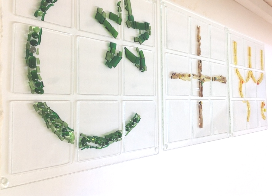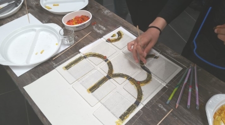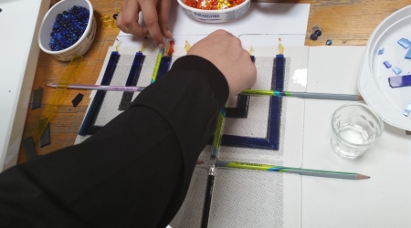 Unter fachkundiger Anleitung durch Bernd Kriegisch vom Glas-Stad´l bastelten wir Schmelzglas-Objekte für den Gang im ersten Stock. Mit Glasschneidern knipsen wir Kristallglas so, wie wir es brauchen zurecht und arbeiten Nuggets, Granulat und bunte Glasperlen mit ein.